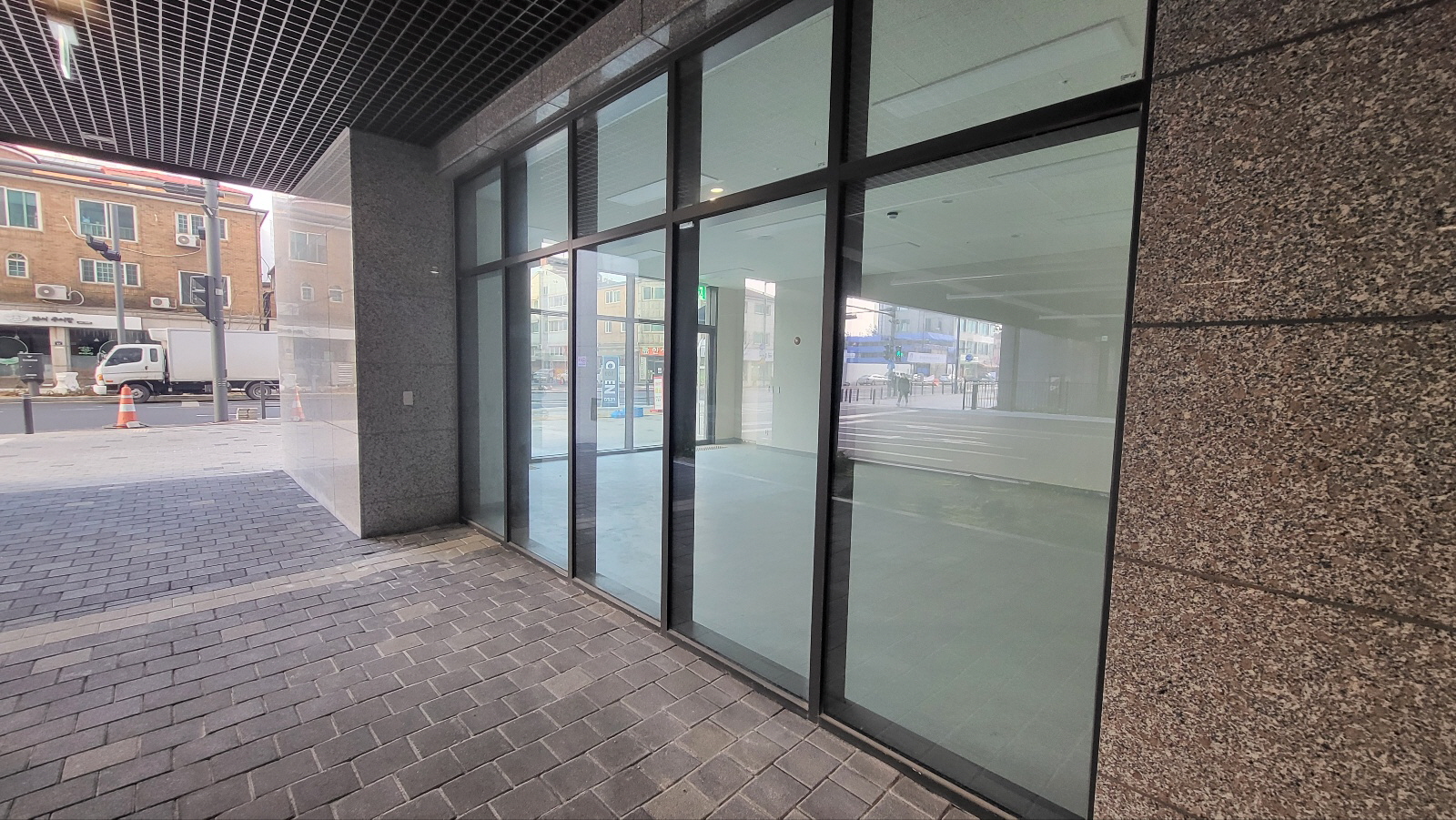상가 정면과 옆면에 출입이 가능한 호실이다.